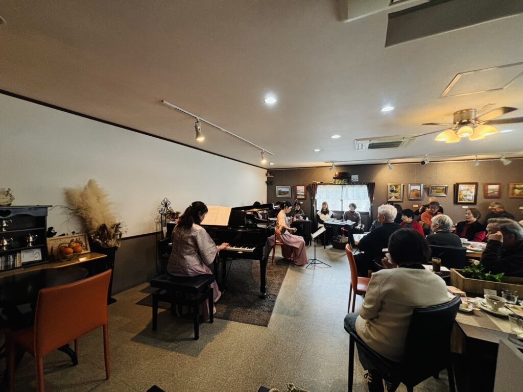 今日は予報された雨も降らず、暖かい春のいいお天気です。今日の演奏会は「2025年全国日曜画家コンクール」受賞されました奥本義博様と西岡陽一様によるスペシャル展示会に合わせて開催させて頂きました。素敵な絵をたくさん飾られた店内には、たくさんの方々が布施先生の素敵のピアノと二胡の演奏を熱心に聴いて頂きました。本当にありがとうございました。美味しい食事と音楽を楽しみながら過ごす時間、是非又堪能してみてくださいね。次回の演奏会は5月29日金曜日と予定しております。早めのご予約お待ちしております。